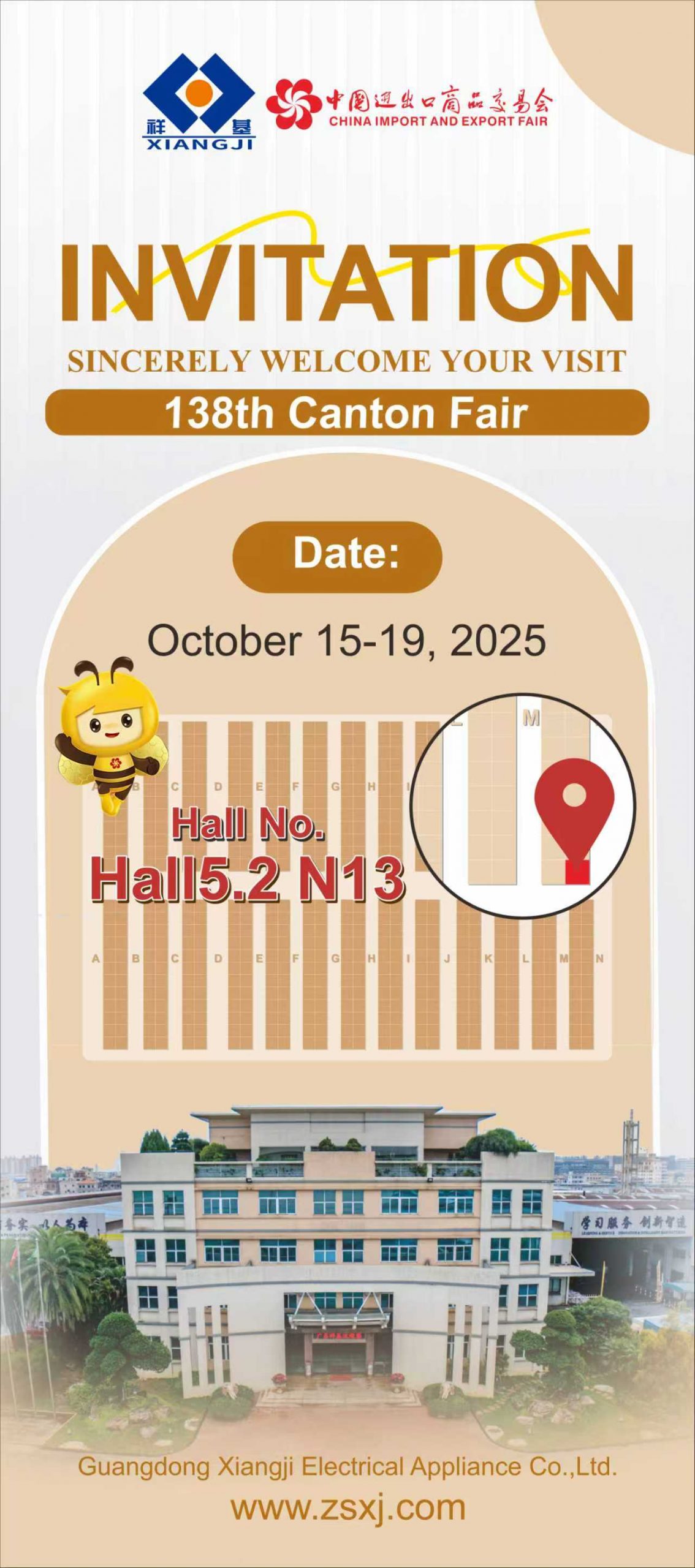We would like to cordially invite you to visit Guangdong Xiangji Electric Co., Ltd. at the 137th Canton Fair. Our booth number is Hall 5.2 D47-48, and the fair will be held from April 15-19, 2025.